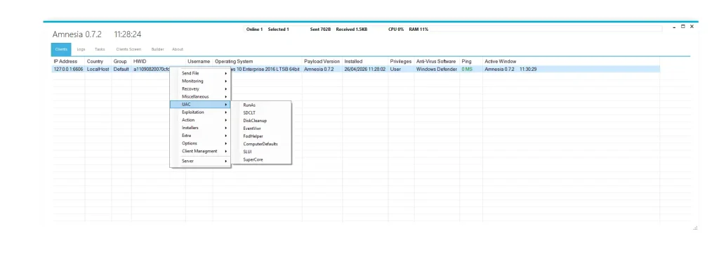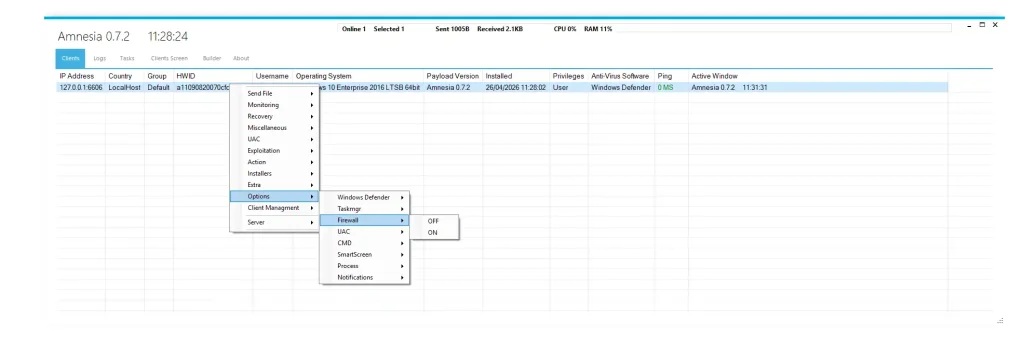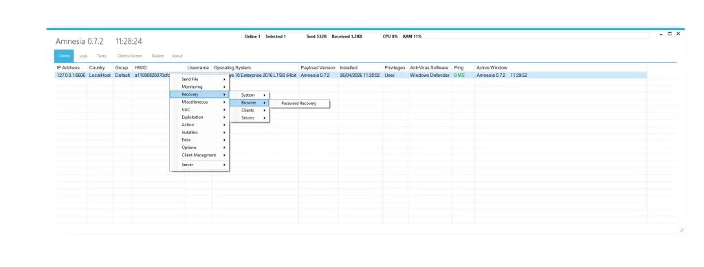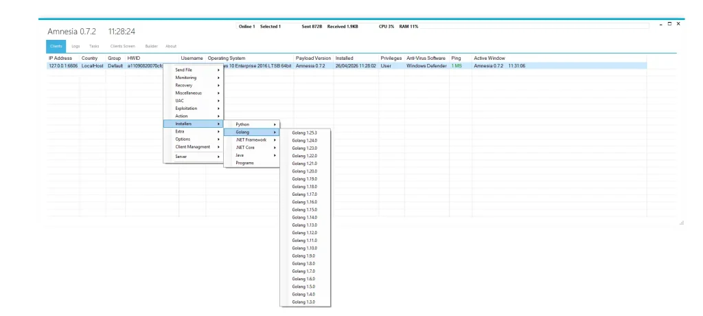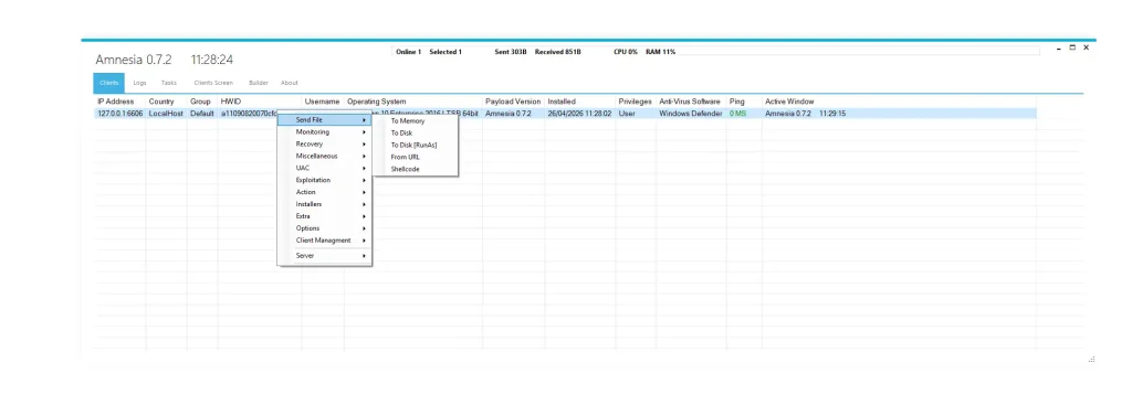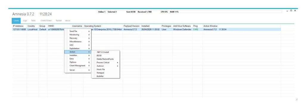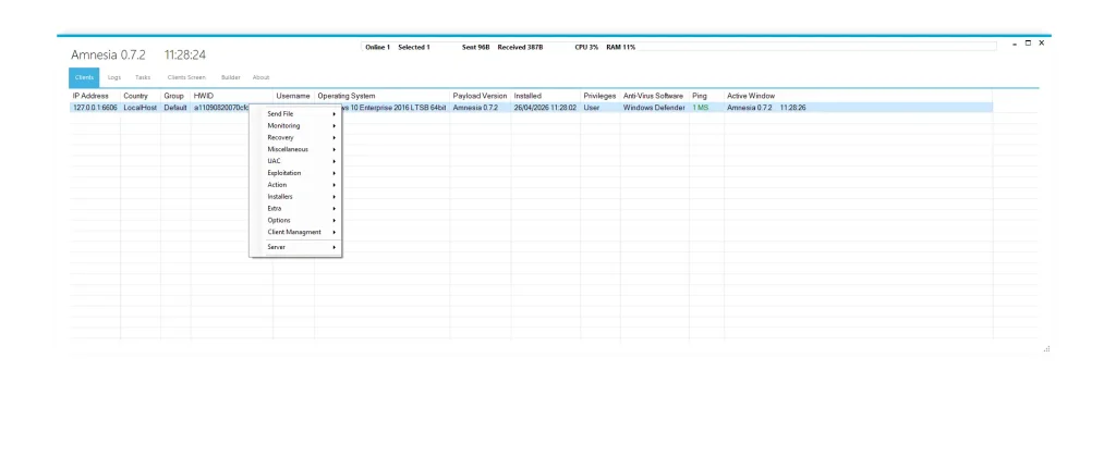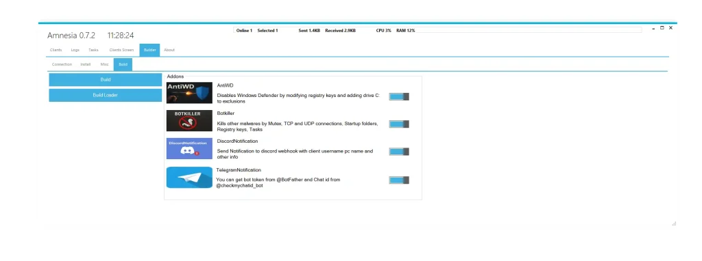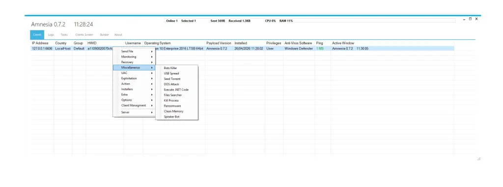 Unlike traditional malware, Amnesia 0.7.2 operates like a full cyber operations toolkit. It enables attackers to remotely control infected machines, steal sensitive information, bypass security systems, and maintain long-term access without detection.