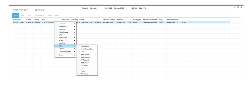 Amnesia 0.7.2 represents a highly advanced Remote Access Trojan built with modular architecture, stealth techniques, and full system control capabilities. It combines surveillance, exploitation, persistence, and ransomware-like behavior into a single cyber weapon framework.