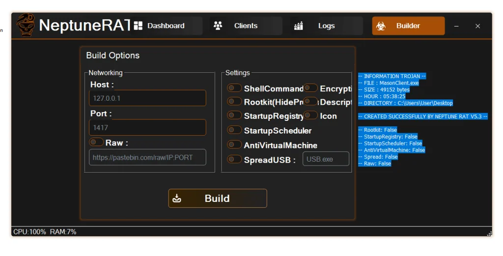 One of the most critical components of Neptune RAT 2026 is its builder module, which allows attackers to configure deployment settings.